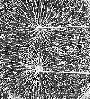 In this Radiation and Shadowing model of remote forces the electrostatic force field is caused by unbalanced,... opposing,... flows [ gradient ] existing in the E subspectra of the Prime radiation. The following photographs reveal the flow lines for the,... ambient,... sink ...and source cases. This model attributes these lines to the unbalanced flow of the Electrostatic subspectra radiation [ Pe ]. The popular standard physics model views these images as force fields and does not propose any cause for the existence of the lines or the force. Elongated satellites, using natural Gravity Gradient Stabilization, are responding to the unbalanced flow [gradient] of the Gravitational subspectra radiation in a manner similar to the polarized grass seeds seen in these photos. It should be recognized that the grains of matter, used to form these images, may cause a streaming effect that may not exactly represent the actual radiation flow lines.